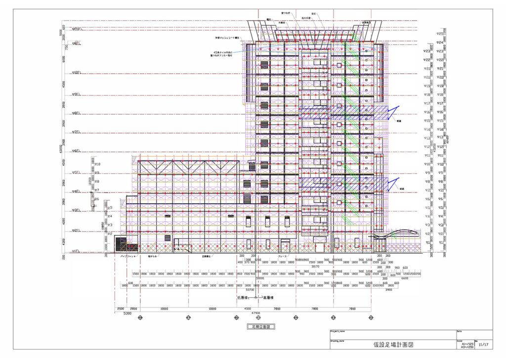 当社では仮設足場の設計を全国対応にて行なっています。足場専門の設計士がお客様のご要望に合わせた足場図面を作成いたします。また、お客様の納期に合わせてスピード納品対応も可能です。詳細はお問い合わせください。